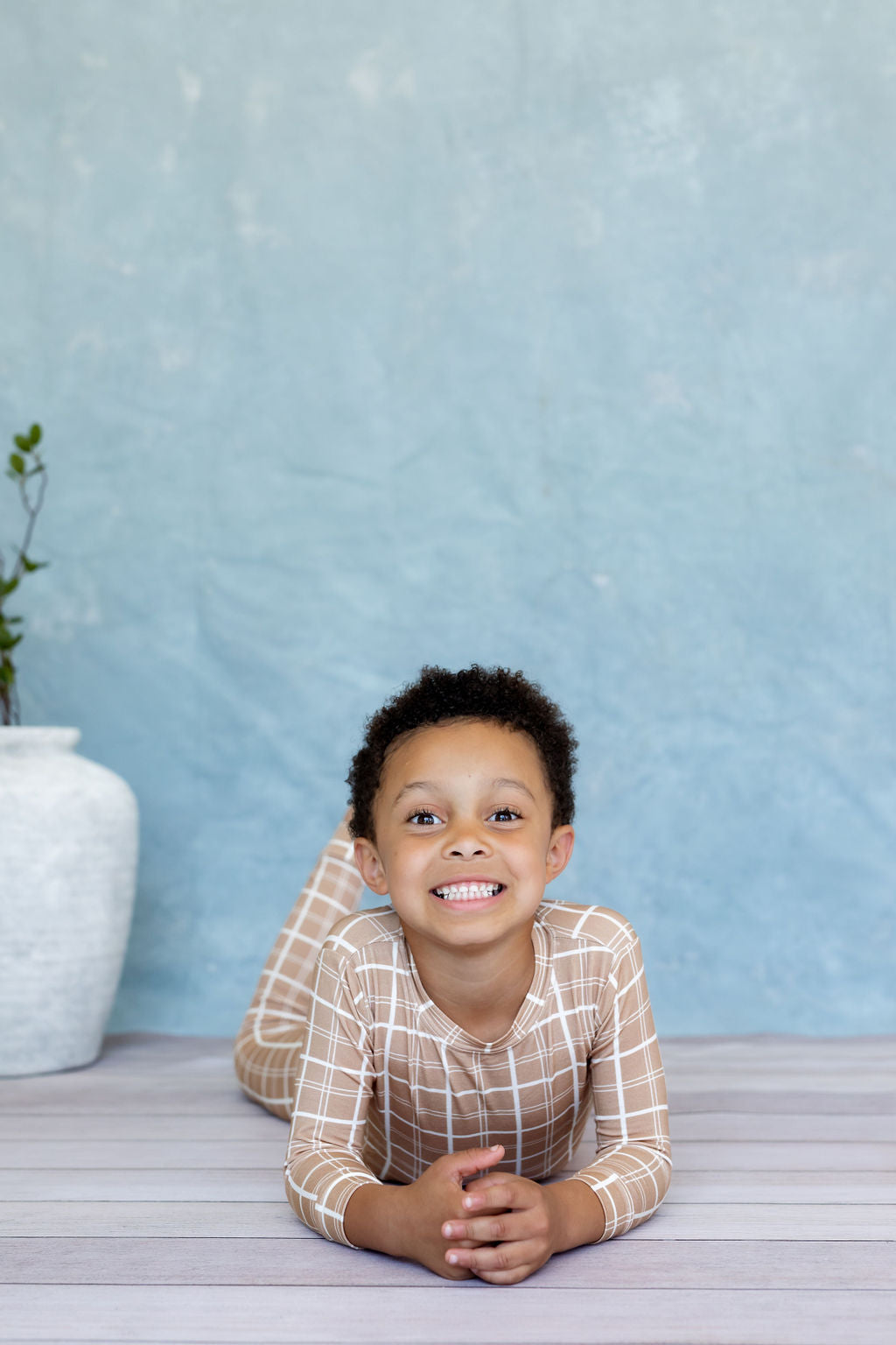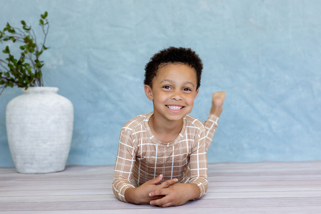 The Sandy Horizon Plaid Two Piece Pajama is the perfect sleepwear for your little ones. Made with 95% viscose bamboo and 5% spandex, it provides maximum comfort and a soft touch. Your child can sleep peacefully without any irritation from tags. Trust in our product for a better night's sleep. A must-have for your little ones.